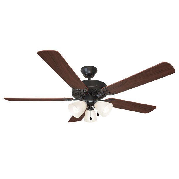 This ceiling fan comes with five reversible blades (dark mahogany and light maple).